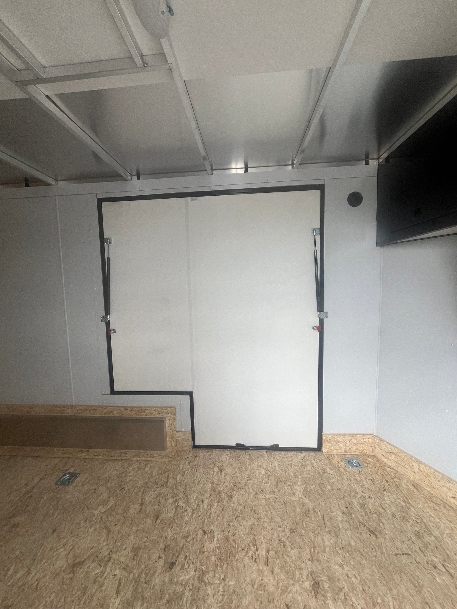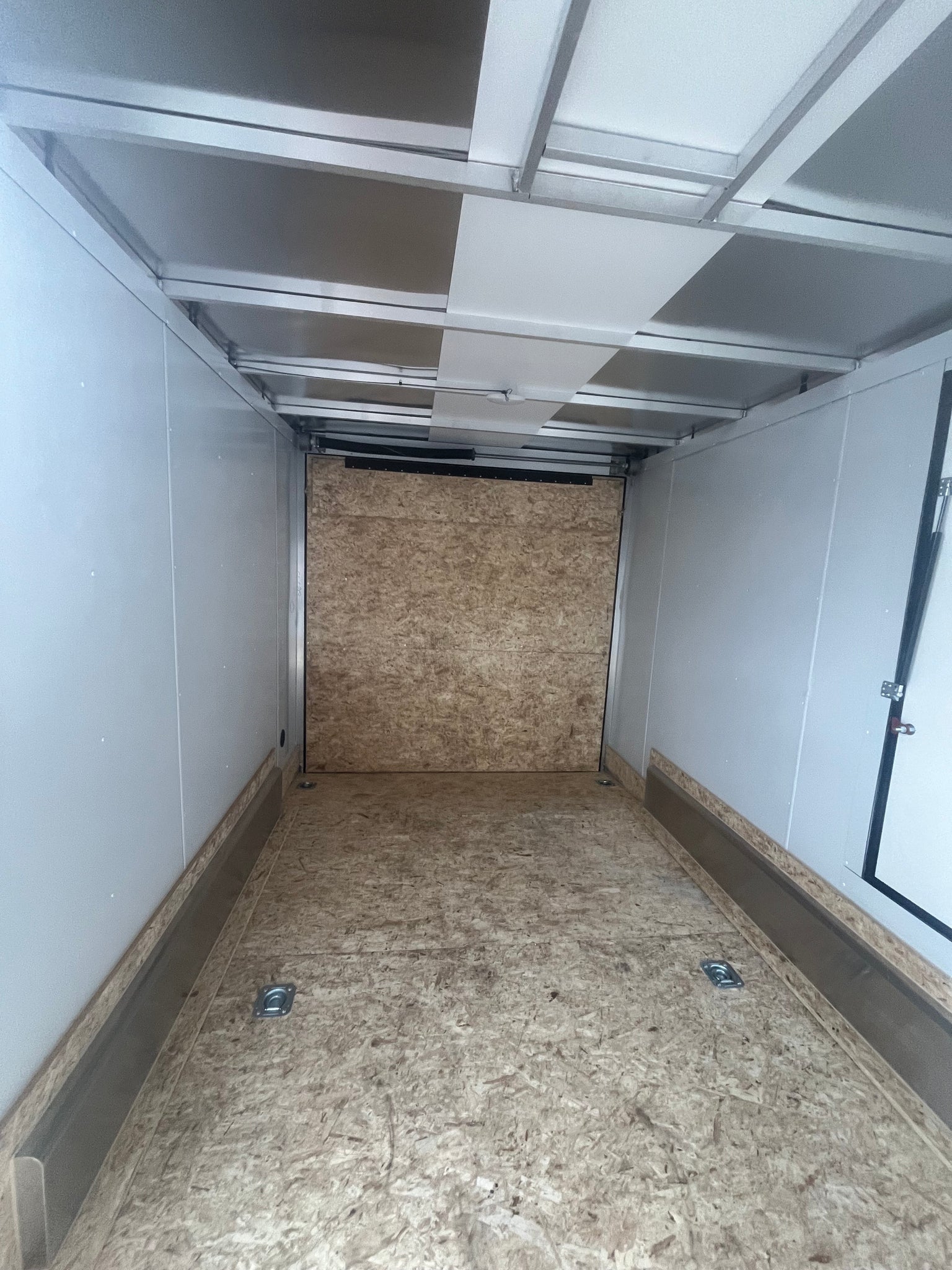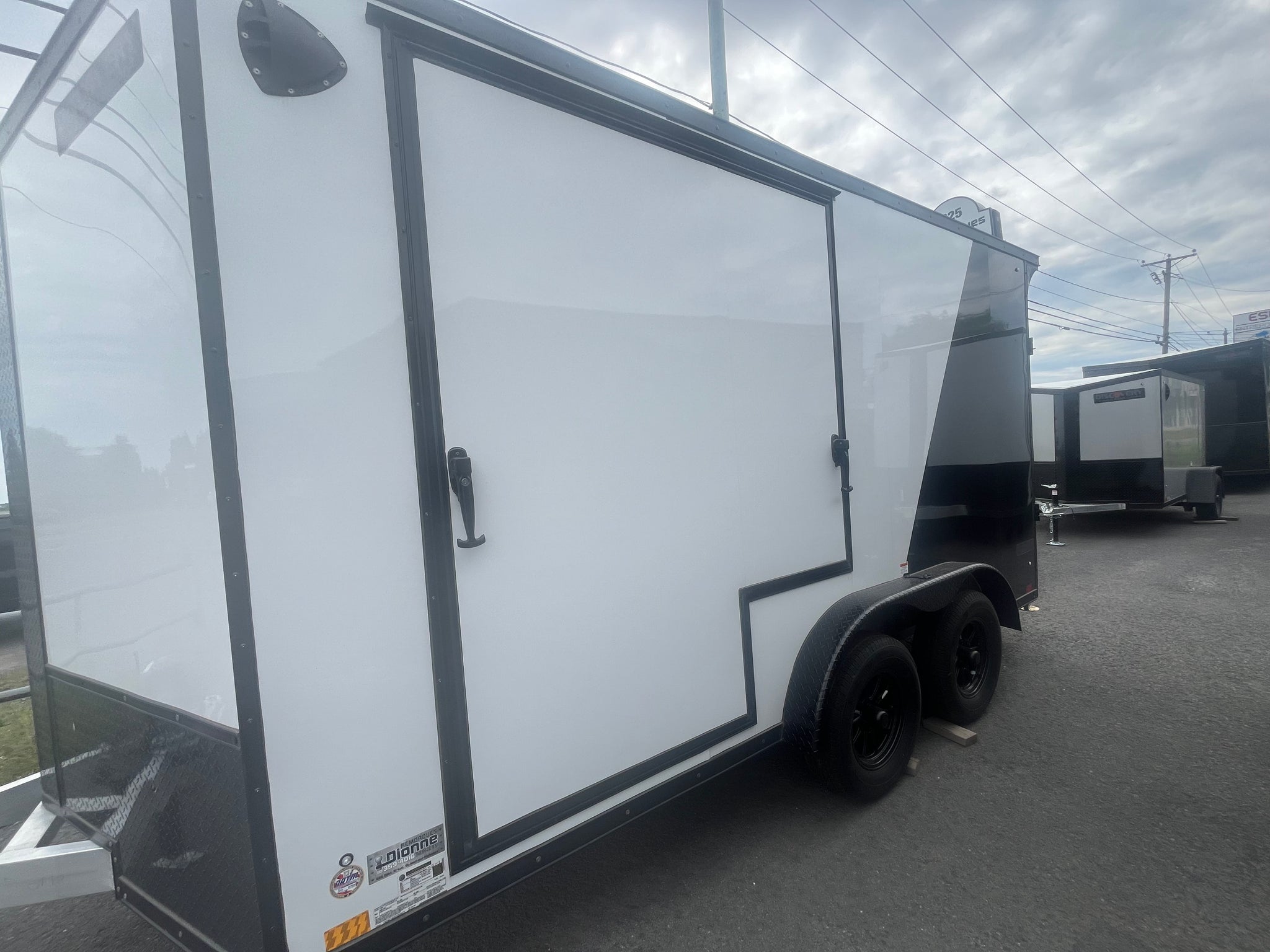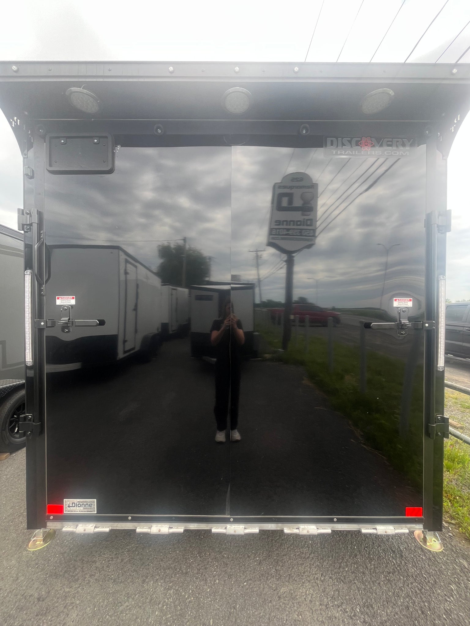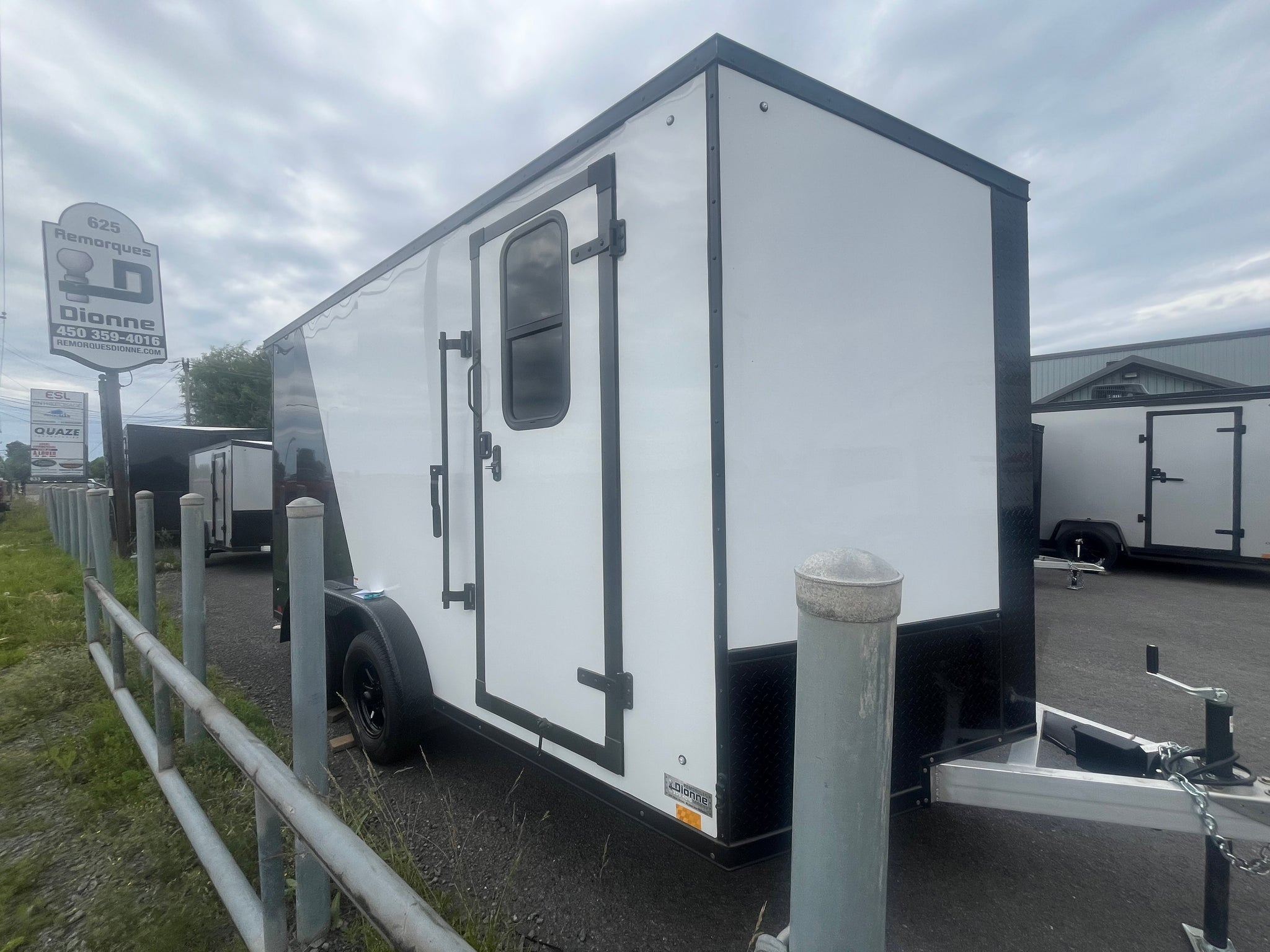 Remorque fermée Discovery série Endeavor, 7.5' x 14' + v-nose, structure 100% aluminium, 2 essieux de 3500lbs glissière, freins électriques, jantes aluminium, porte rampe + beavertail (ouverture de porte de 84'', porte latérale pour side-by-side, toit aluminium 1 pièce, 6 ancrages au plancher, ensemble blackout, porte latérale 32''avec fenêtre, poignée VR et barlock, hauteur intérieure 84'', extérieur sans vis, murs blancs, plancher type rainblock 3/4'', lumières de recul, armoires à casque dans le haut du v-nose,